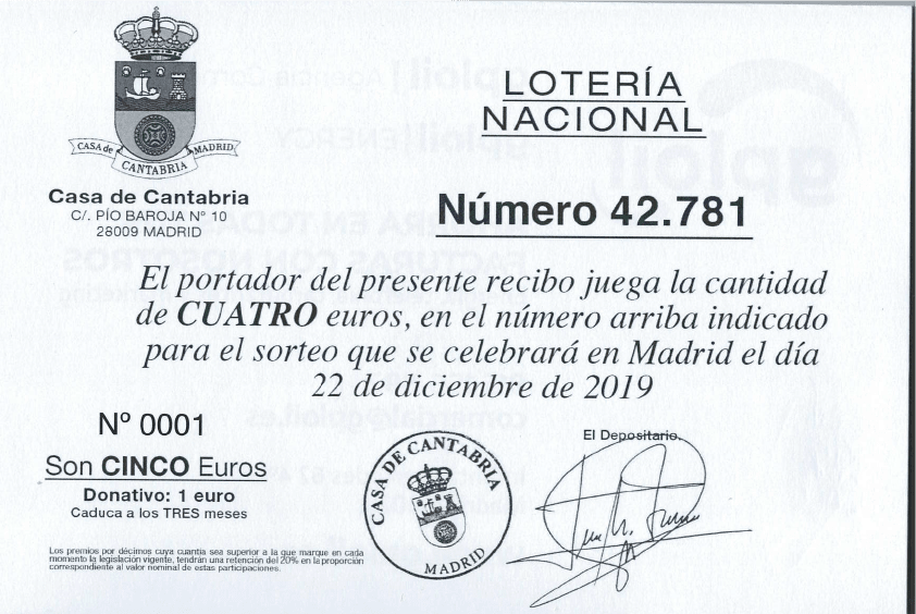 28 de octubre de 2019 Loteria de Navidad de la casa nº 42.781 Ya está a disposición de todos Ustedes. No se quede sin su participación.