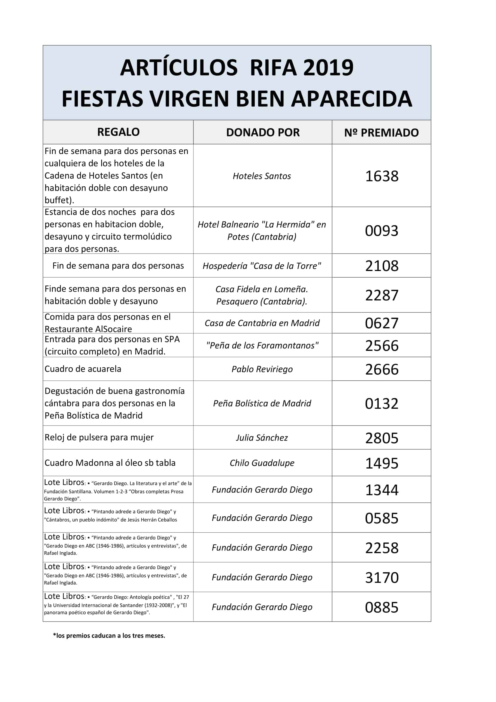 2 de octubre de 2019 Números premiados de la rifa de las fiestas de la Virgen de la Bien Aparecida 2019