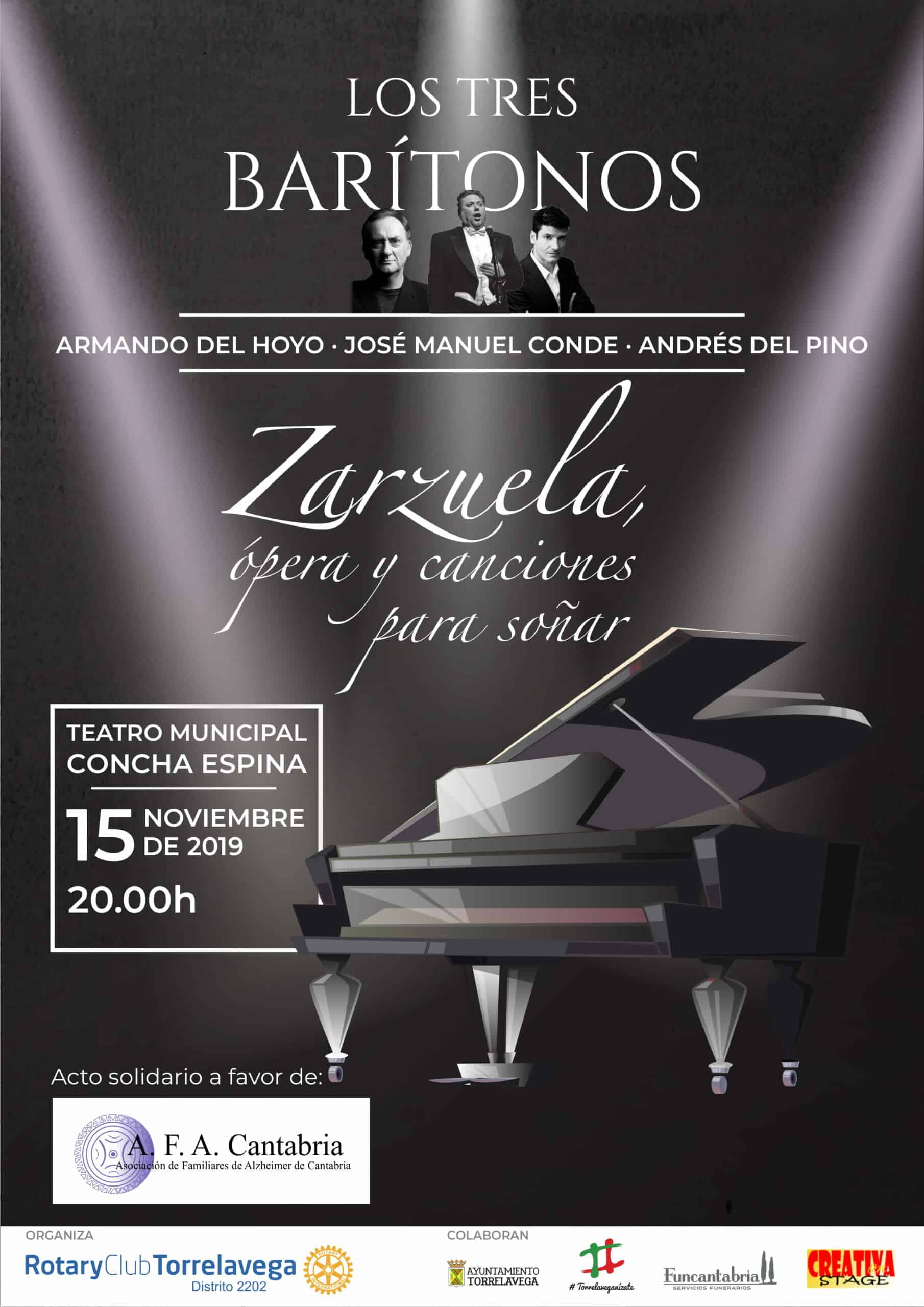 El próximo viernes 15 de noviembre a las 20:00 horas, en el teatro municipal Concha Espina de Torrelavega, los Tres Barítonos, Armando del Hoyo-Jose Manuel Conde-Andrés del Pino, ofrecerán un concierto titulado “Zarzuela, ópera y canciones para soñar”. Se trata de un acto solidario a favor de la Asociación de Familiares del Alzheimer de Cantabria. Organizado por Rotary Club Torrelavega-Distrito 2202- y con la colaboración del Ayuntamiento de Torrelavega, Torrelaveganizate, Funcantabria y Creativa Stage.