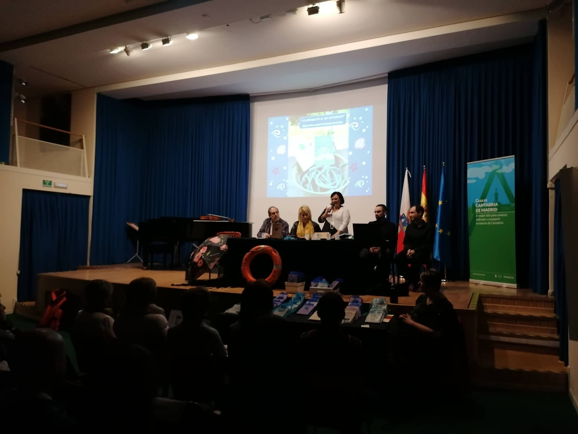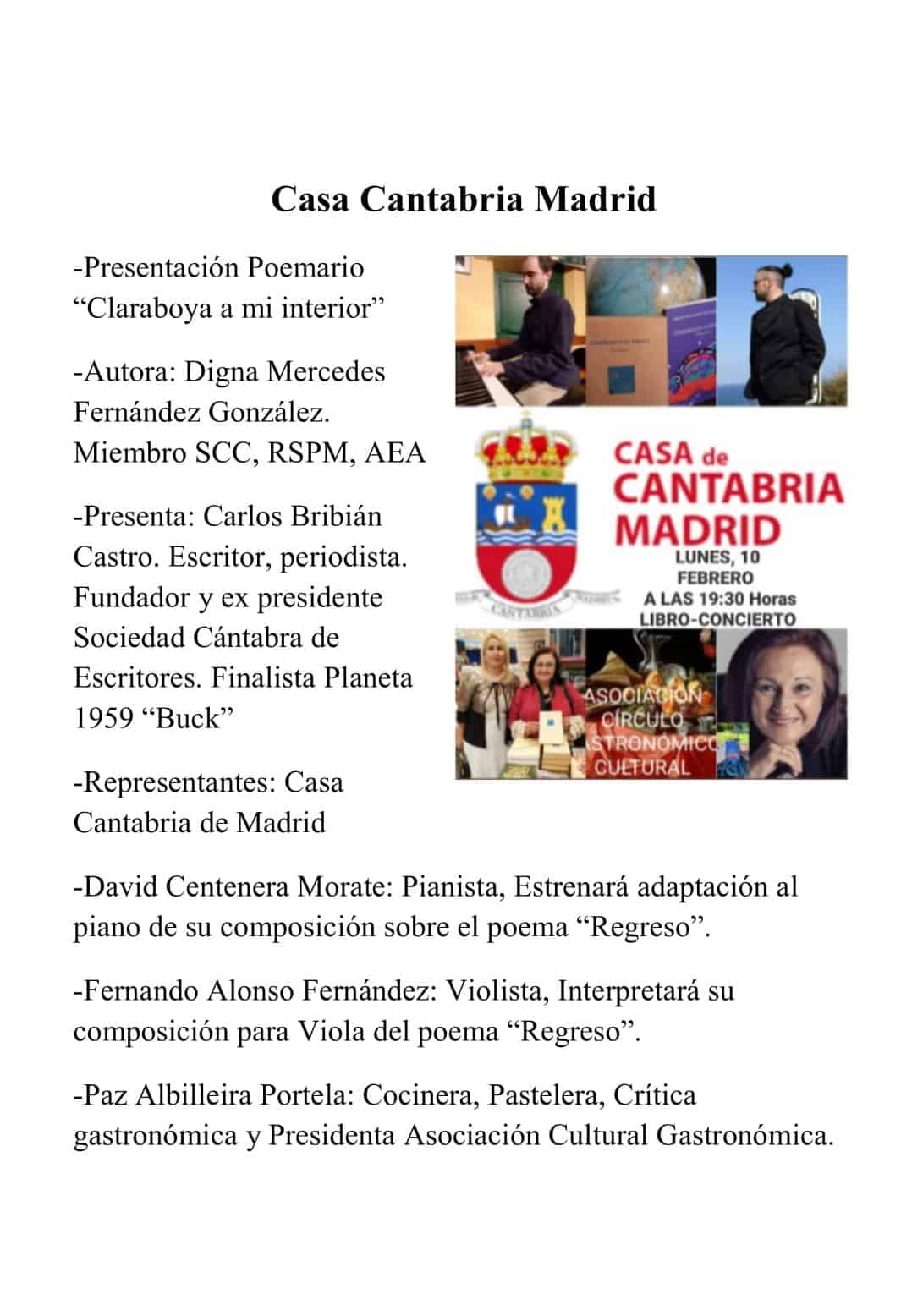 Si por algo destacó la presentación del nuevo libro de Digna Mercedes Fernández fue por la cantidad de apoyos con los que contó de diversas personalidades de la cultura cántabra, entre los que se encontraba nuestro apreciado Juan Francisco Quevedo. La Vicepresidenta Doña Carmen Ruiz Ballesteros dio la bienvenida a esta escritora cántabra, evidenciándose una vez más la labor de apoyo a los escritores de nuestra tierruca para que presenten sus libros en la Casa de Cantabria en Madrid. Carlos Bribián, fue el gran mentor de la autora y así se evidenció en el acto. Se pudo disfrutar en esta presentación del estreno por parte de David Centenera de su composición sobre el poemario “Regreso”, y del violinista Fernando Alonso de su composición sobre el citado poema.