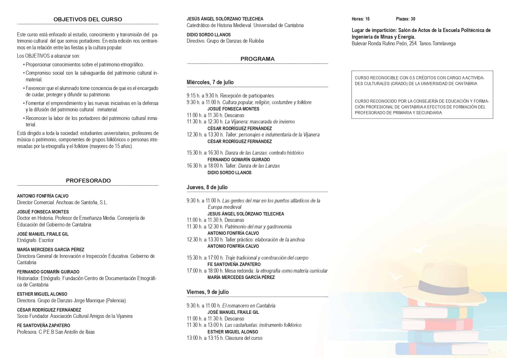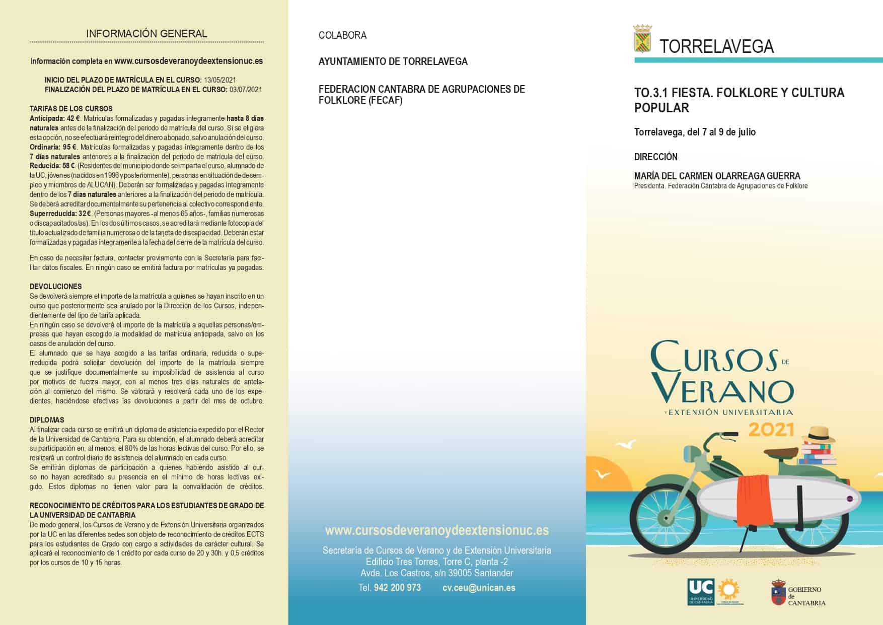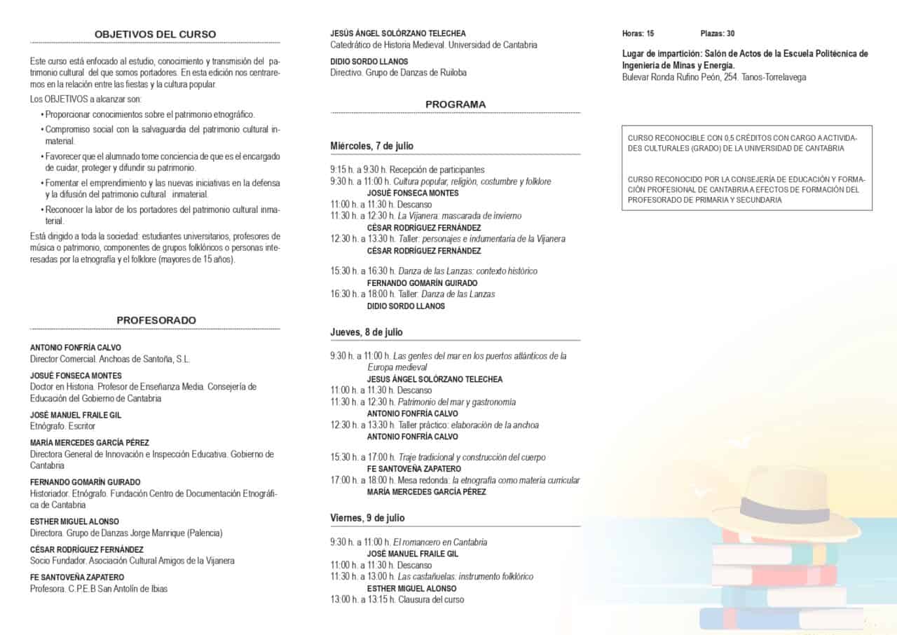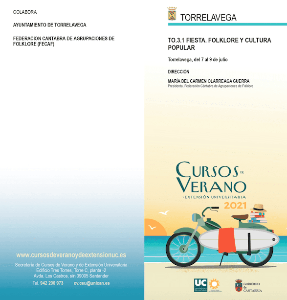 Del 7 al 9 de julio de 2021 se llevará a cabo en la Escuela Politécnica de Ingeniería de Minas y energía de Torrelavega el Curso de Verano “Fiesta. Folklores y Cultura Popular” dirigido a toda la sociedad, estudiantes universitarios, profesores de música o patrimonio, componentes de grupos folklóricos o personas interesadas por la etnografía y el folklore (mayores de 15 años). Es un curso dirigido por nuestra socia y gran colaboradora Maria del Carmen Olarreaga Guerra Presidenta de la Federación Cántabra de Agrupaciones de Folklore y secretaria, tesorera y coordinadora general del Grupo de Danzas Virgen de las Nieves (Tanos), Socio de Honor de la Casa de Cantabria en Madrid.