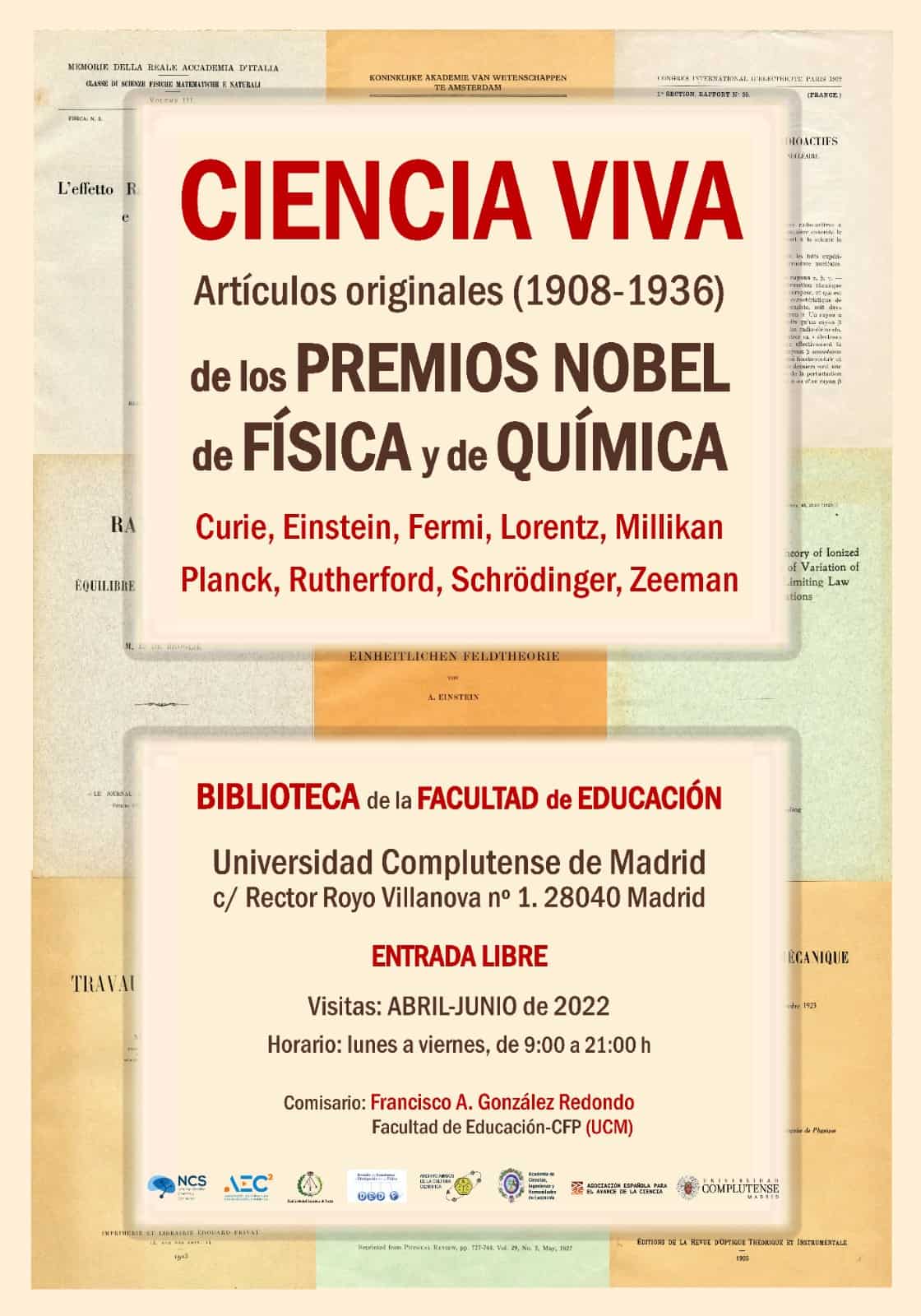 El lunes 4 de abril se inaugura esta exposición en la Biblioteca de la Facultad de Educación de la UCM, reuniendo en torno a cuarenta separatas originales de artículos de investigación publicados entre 1908 y 1936 por personalidades galardonadas con el Premio Nobel de Física y de Química tales como Marie Sklodowska-Curie, Albert Einstein, Peter Debye, Enrico Fermi, Hendrick Lorentz, Linus Pauling, Max Planck, Ernest Rutherford, Erwin Schrödinger, Pieter Zeeman, etc. Junto a ellos, podrán verse trabajos relacionados con la Física y la Química publicados por los dos científicos españoles galardonados con otros Premios Nobel, José Echegaray Eizaguirre (Nobel de Literatura) y Santiago Ramón y Cajal (Nobel de Medicina).