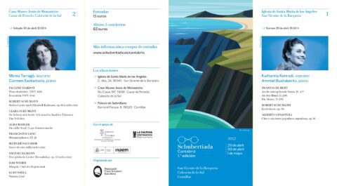 Del 29 de abril al 1 de mayo tendrá lugar la Schubertiada Cantabria, un nuevo festival de conciertos excepcionales de música clásica en espacios emblemáticos de San Vicente de la Barquera, Cabezón de la Sal y Comillas. Los conciertos contarán con algunos de los músicos de más prestigio del panorama internacional como las sopranos Katharina Konradi, Erika Baikoff así como el pianista Till Fellner y el Cuarteto Cosmos.
