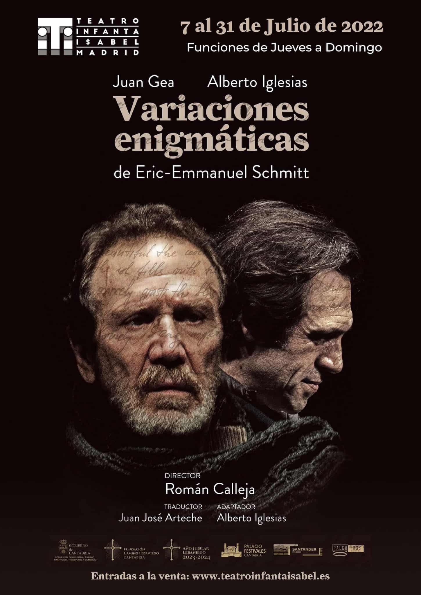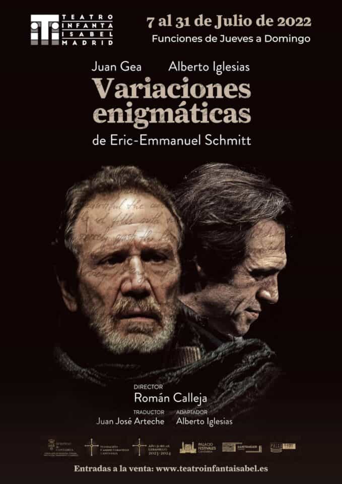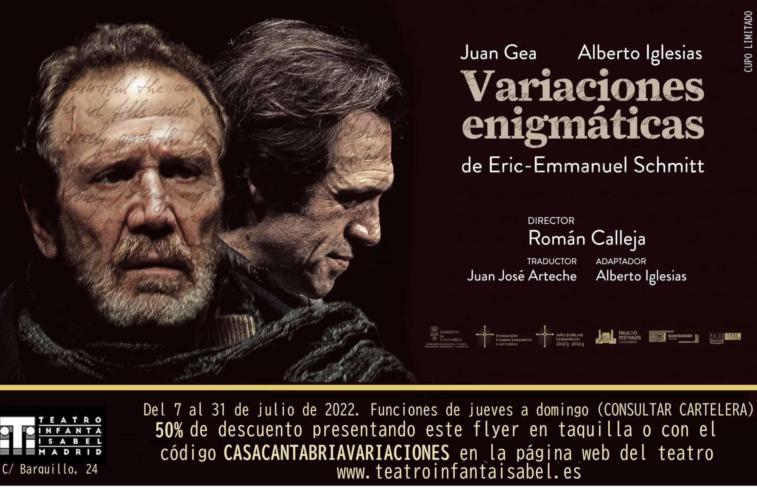 Queremos informarles que del 7 al 31 de Julio en el Teatro Infanta Isabel de Madrid en sesiones de Jueves, Viernes y Sábado a las 19.00h y los Domingos a las 18.00h, se invita a los socios de la Casa de Cantabria en Madrid con un 50% de descuento a la representación de la obra “Variaciones Enigmáticas” de Eric-Enmanuel Schmitt, con los actores Juan Gea y Alberto Iglesias y dirigida por Ramón Calleja.