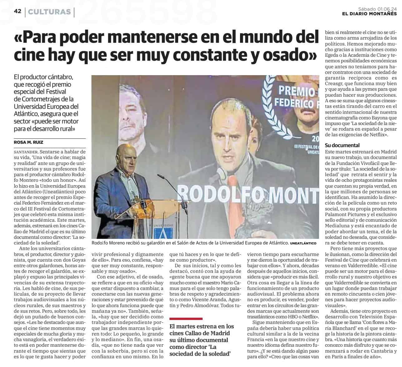 14 de junio de 2024 Rodolfo Moreno recibe el Premio Especial Federico Fernández El producto cántabro, que recogió el premio especial del Festival de COrtometrahes de la Universidad Europea del Atlántico, asegura que el sector «puede ser motor para el desarrollo rural».