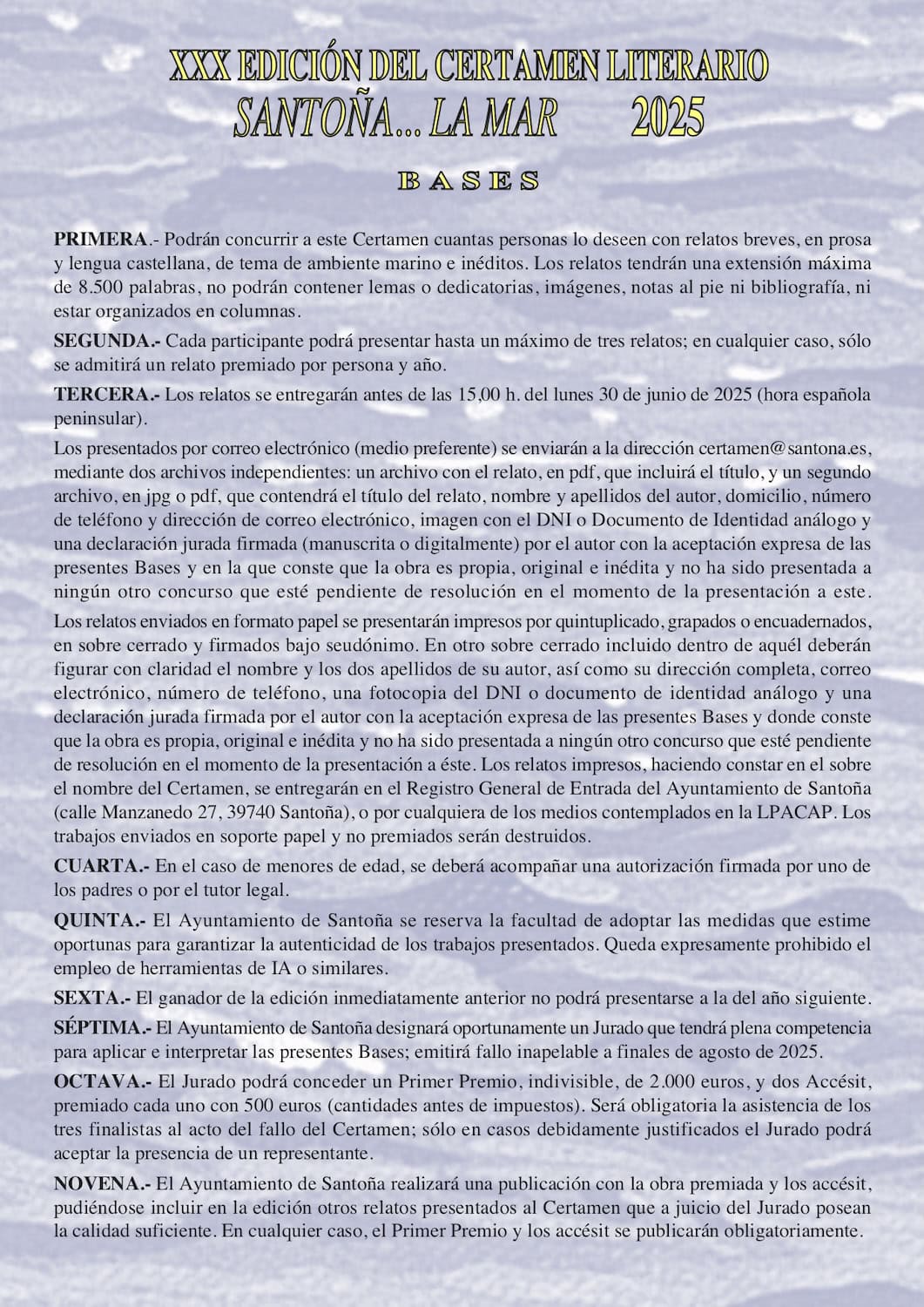En su objetivo de “promover la afición y el cultivo de las actividades literarias”, la Concejalía de Cultura del ayuntamiento de Santoña ha convocado la XXX edición del Certamen Literario Santoña… la mar correspondiente al año 2025.