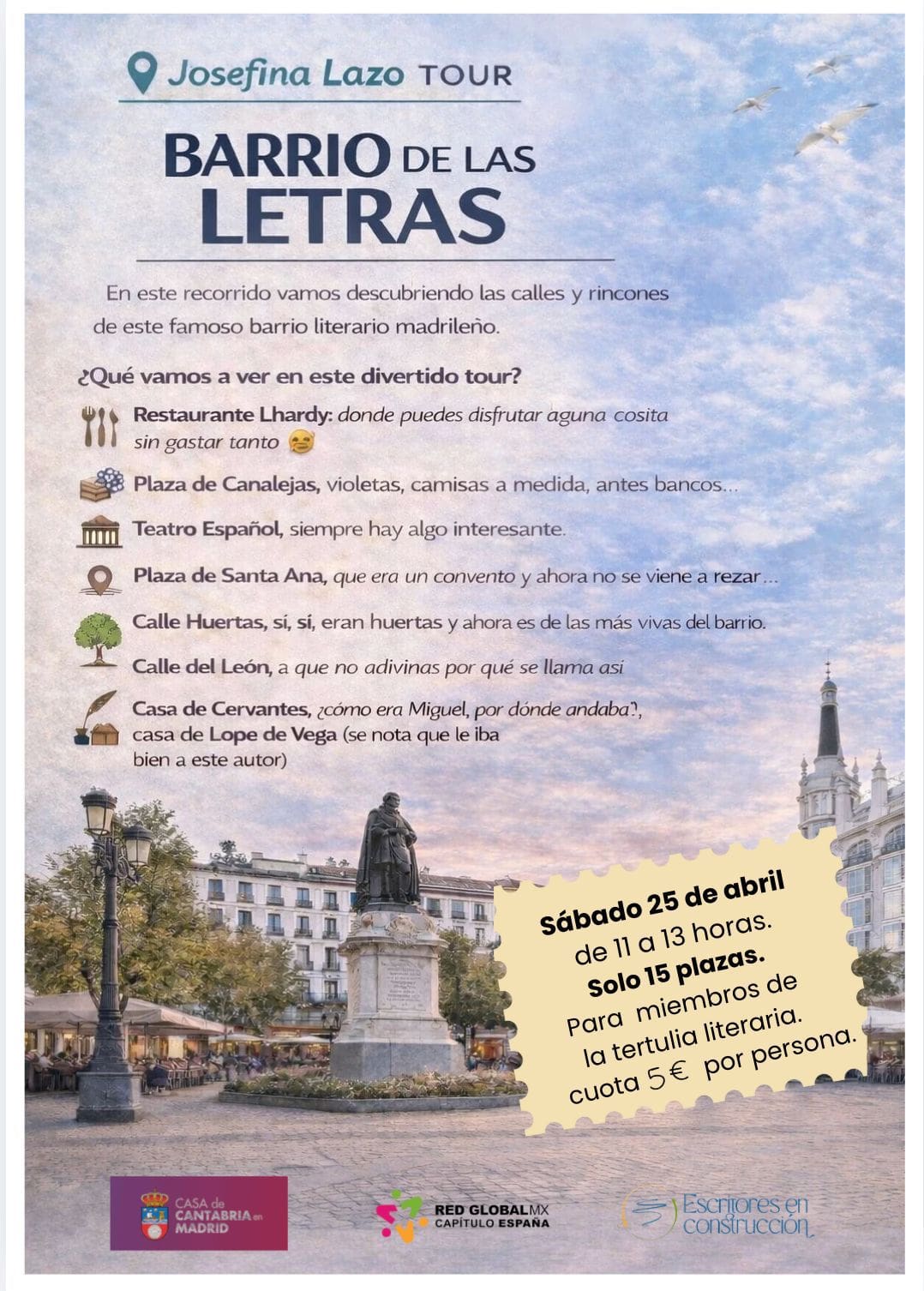 - Itinerario: Se visitarán puntos clave como el Restaurante Lhardy, la Plaza de Santa Ana, la Calle Huertas y las casas de grandes genios como Cervantes y Lope de Vega.
