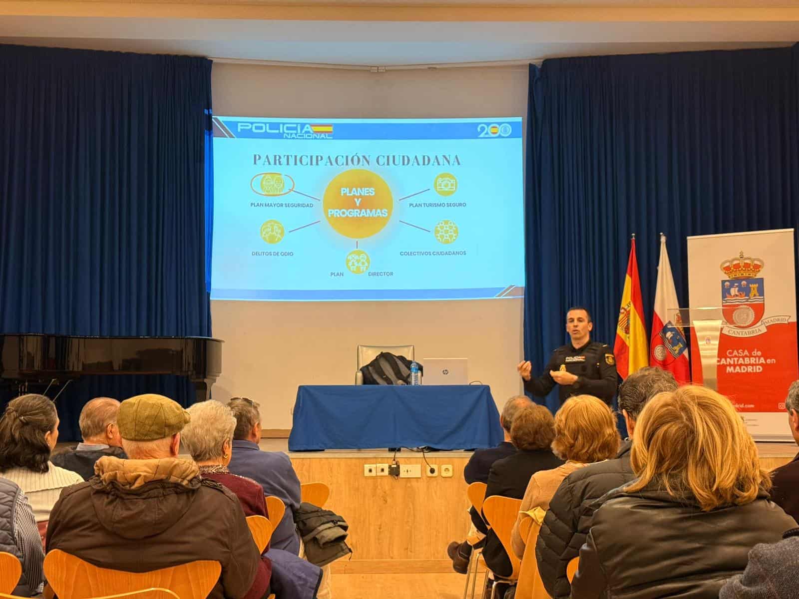 La Casa de Cantabria en Madrid celebró el día de hoy, jueves 12 de marzo, la conferencia «Plan Mayor: Consejos de Seguridad», una sesión informativa centrada en la prevención de delitos y la seguridad de las personas mayores, que tuvo lugar en el Salón de Actos de la institución.